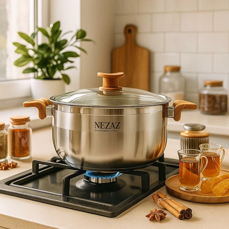 یکی از وسایل مهم در هر آشپزخانه ای، سرویس قابلمه و تابه می باشد. داشتن یک قابلمه و ماهیتابه مناسب با کیفیت مرغوب، لذت آشپری را دو چندان می نماید. قابلمه ی استیل نزاز سایز 24 یکی از قابلمه های موجود در بازار با ظاهری بسیار زیبا، درب پیرکس و کف چدن با کیفیت خوب می باشد. این محصول دارای کفه ی ضخیم و چدن می باشد.