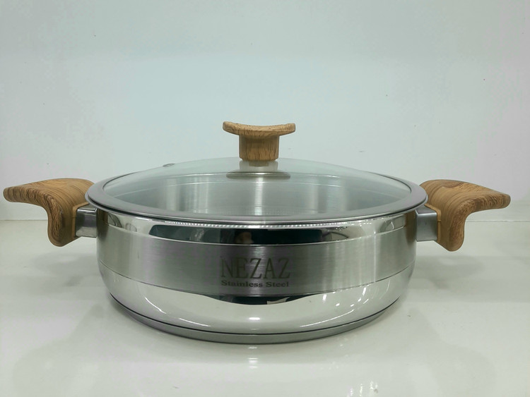 یکی از وسایل مهم در هر آشپزخانه ای، سرویس قابلمه و تابه می باشد. داشتن یک قابلمه و ماهیتابه مناسب با کیفیت مرغوب، لذت آشپری را دو چندان می نماید. تابه استیل نزاز سایز 20 یکی از تابه های موجود در بازار با ظاهری بسیار زیبا، درب پیرکس با کیفیت خوب می باشد. این محصول دارای کفه ی ضخیم و چدن می باشد.