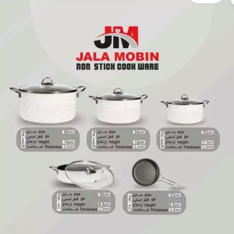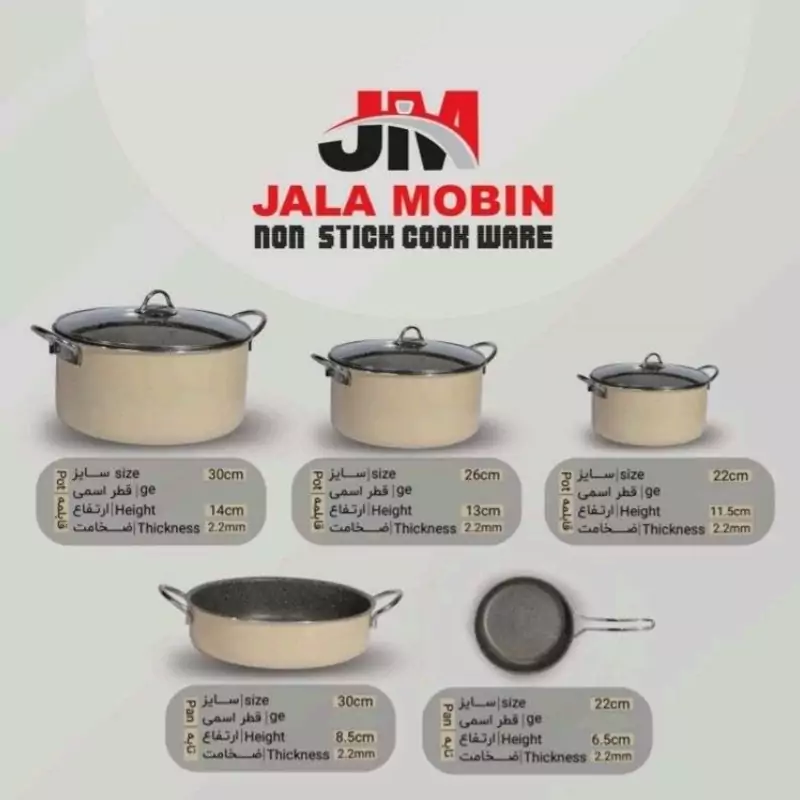 سایز قابلمه ها 22،26،30 سایز تابه تک دسته 22 با درب مشترک سایز تابه دو دسته 30 با درب مشترک